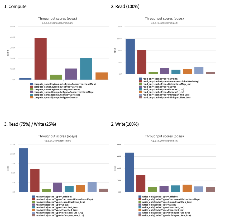 위 데이터는 스프링에서 제공하는 캐시들의 초당 데이터 처리량 비교 자료이고, 데이터에서 알 수 있듯이 Caffeine은 매우 우수한 지표를 보여주고 있다. 다른 기능이 딱히 필요가 없고, 단지 Read와 Write 측면에서 최고의 성능을 보여주고 싶었기 때문에 Caffeine Cache를 활용하기로 결정했다.
